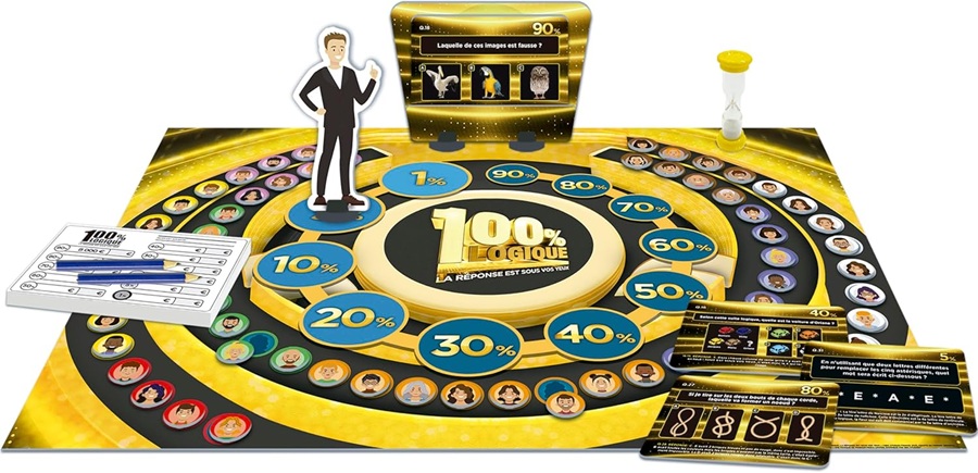 Contenu : plateau de jeu, silhouette présentateur, écran des questions, 6 crayons, 64 jetons, 216 cartes questions recto-verso réparties sur 11 niveaux de difficulté (432 questions), classeur de cartes par niveau de difficulté, sablier, bloc de feuilles de réponses.
