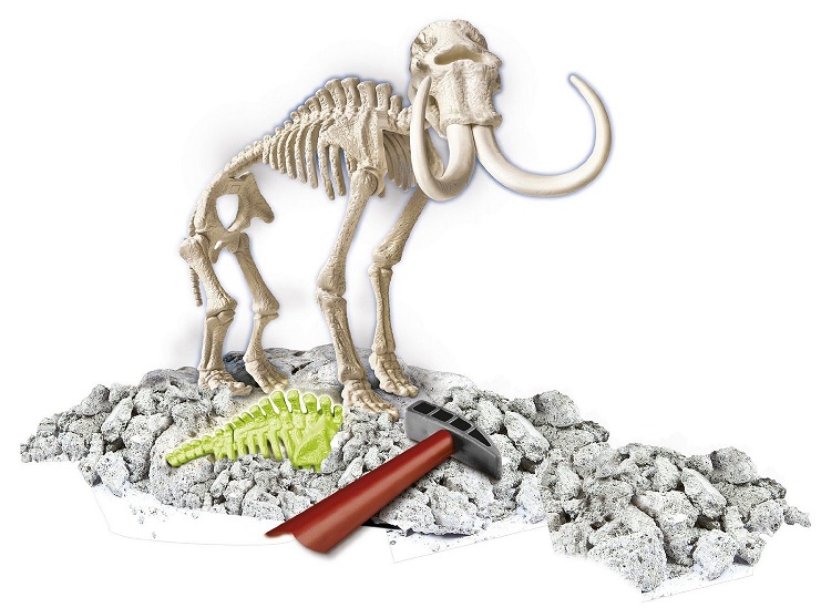 La boîte contient les fossiles du mammouth, 1 marteau, 1 burin, 1 bloc de terre (composé de plâtre, de sable et d’argile ou de pierre ponce), 1 manuel illustré.