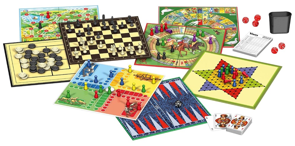 Contenu : 4 plateaux de jeu double face, 57 pions, 32 pions d’échecs, 30 pions de dames, 1 gobelet à dés, 5 dés, 1 dé pour backgammon, 1 bloc de yam, 1 jeu de 32 cartes, les règles des jeux.