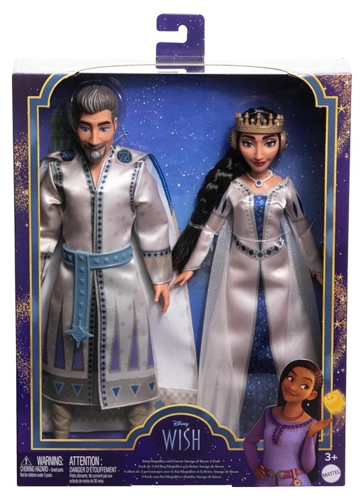 Un coffret de 2 poupées, Le Roi Magnifico et La Reine Amaya du Royaume de Rosas, inspirées des deux souverains du film Wish de Disney.