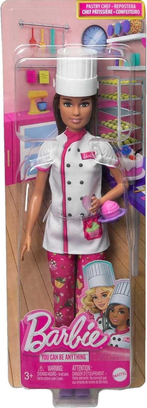 La poupée Barbie Cheffe pâtissière adore préparer de délicieux gâteaux ! Toujours prête à essayer de nouvelles recettes, elle arbore une tenue complète avec une blouse et une toque de chef. Elle peut également servir les clients grâce au délicieux cupcake inclus avec son assiette.
