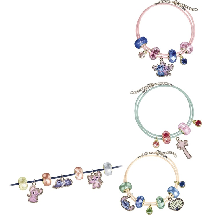 Contenu : 4 colliers ou/et bracelets en cordon, 15 perles scintillantes, 7 charms Stitch et Angel, 6 perles pendentifs et 1 notice.