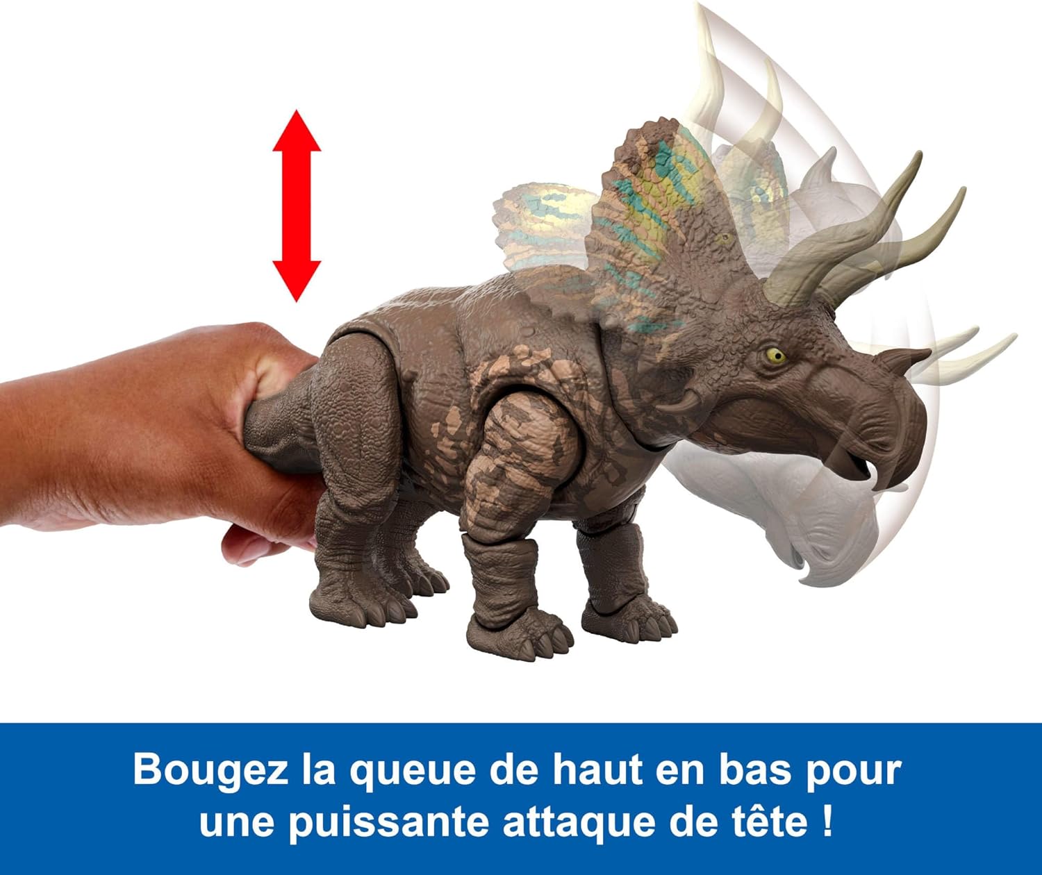 Cette figurine articulée de dinosaure Eotriceratops Méga Prédateurs inspirée du film. Elle possède 2 coups spectaculaires activés grâce à sa queue ! Attaque de grande ampleur ! Faites bouger sa queue de haut en bas pour déclencher une morsure spectaculaire et d’un côté à l’autre pour qu’il assène des coups de bras ! Ce dinosaure issu d’une espèce géante mesure environ 32 cm de long et arbore une pose, des décorations et une texture authentiques. Il est prêt pour une séance de jeu acharnée ou pour prendre des poses intimidantes.