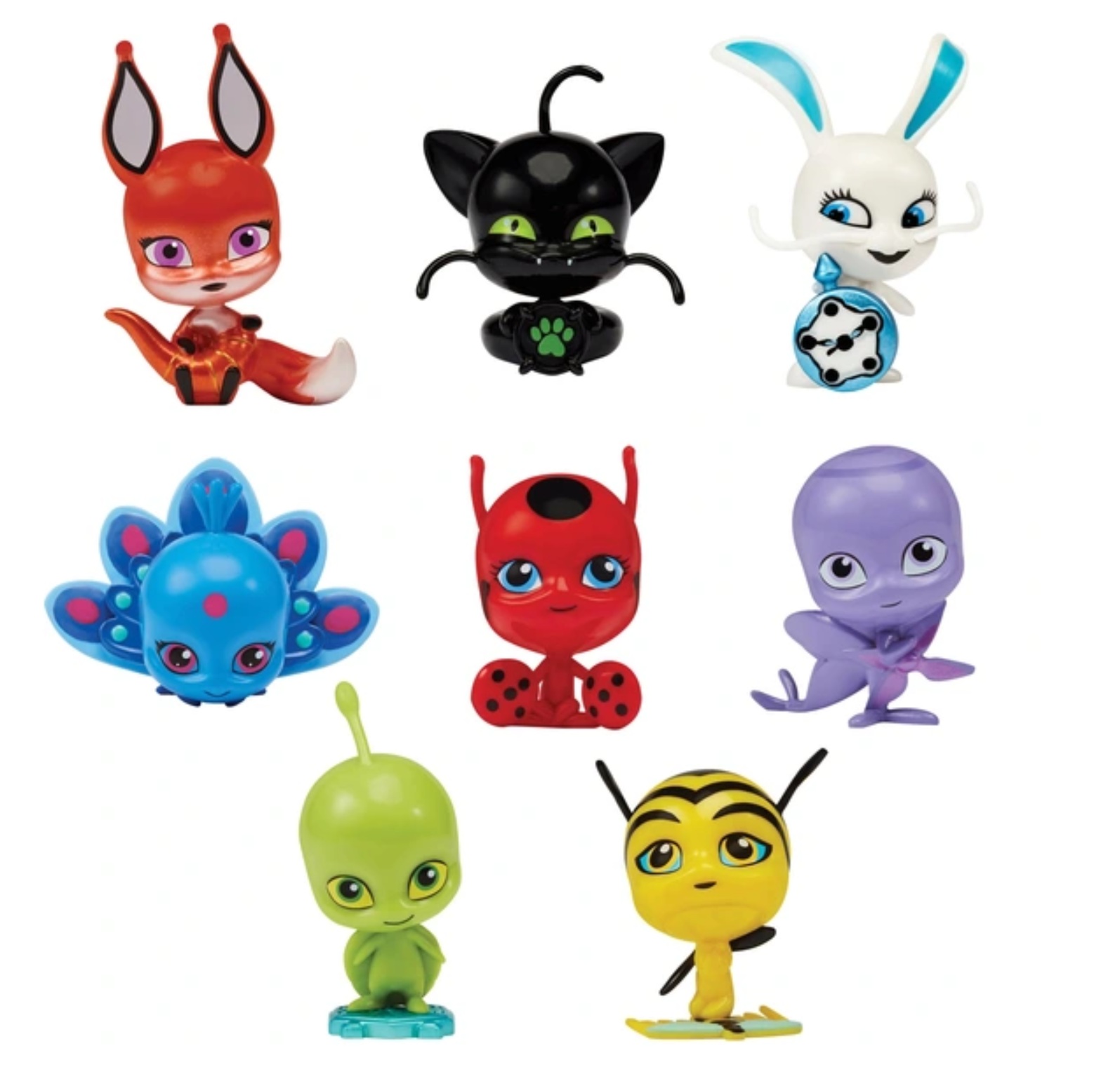 Un coffret de figurines détaillées représentant les kwamis. Ces petites créatures aident les super-héros à se transformer dans chaque épisode de la série Miraculous, les aventures de Ladybug et Chat Noir.