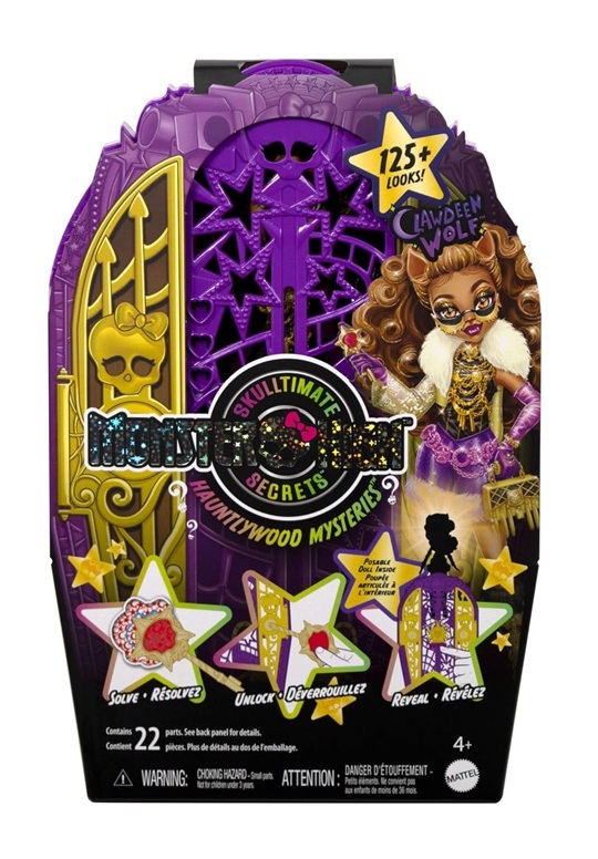 Ce coffret ″Enigmes à Hauntlywood ″ comprend 1 poupée Clawdeen Wolf, 1 dressing à double porte, 1 clé, 2 cartes, 3 breloques, 2 cintres et des vêtements et accessoires assortis.