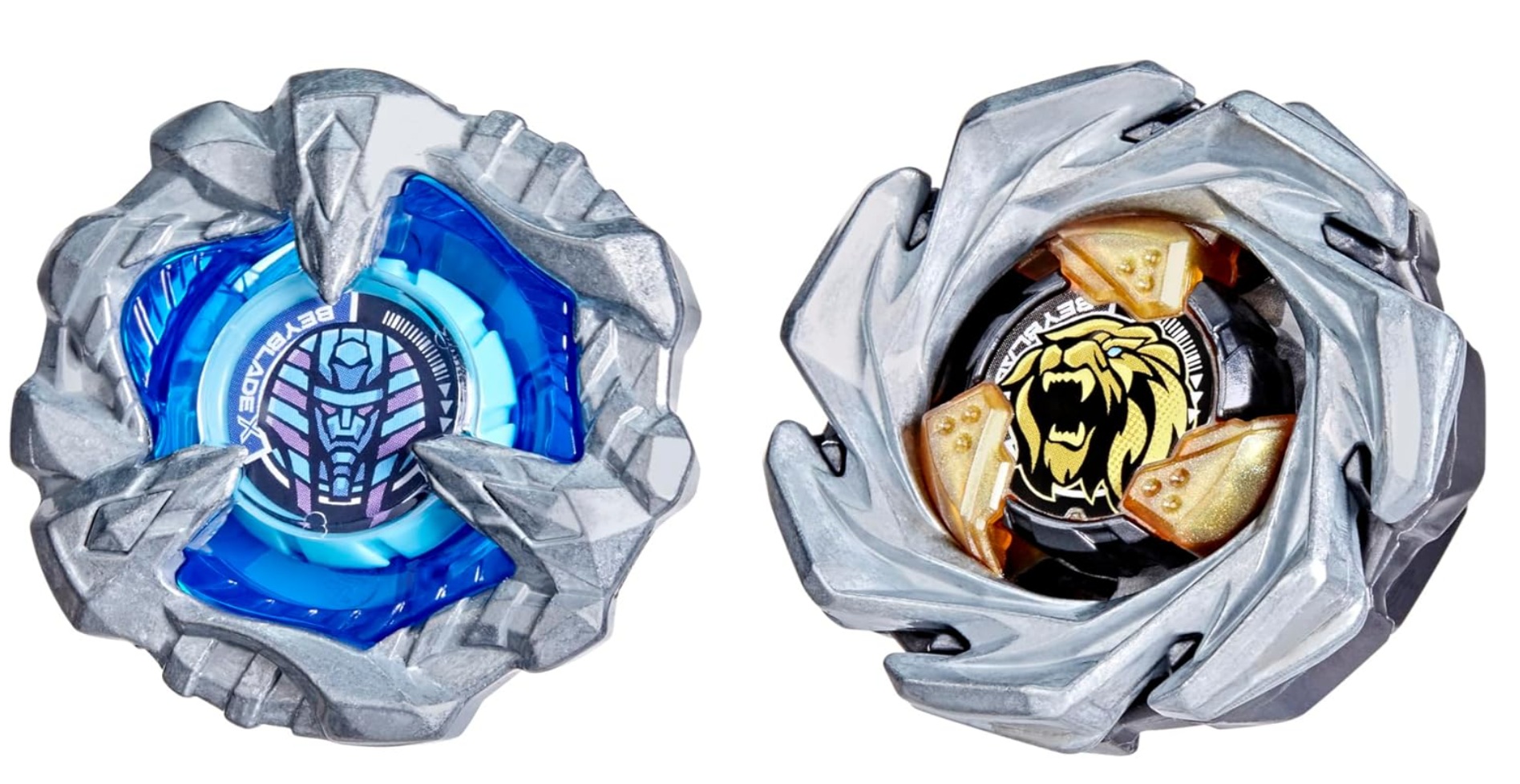 Coffret 2 toupies Beyblade X : Beyblade Cowl Sphinx 1-80GF et Crest Leon 7-60GN.