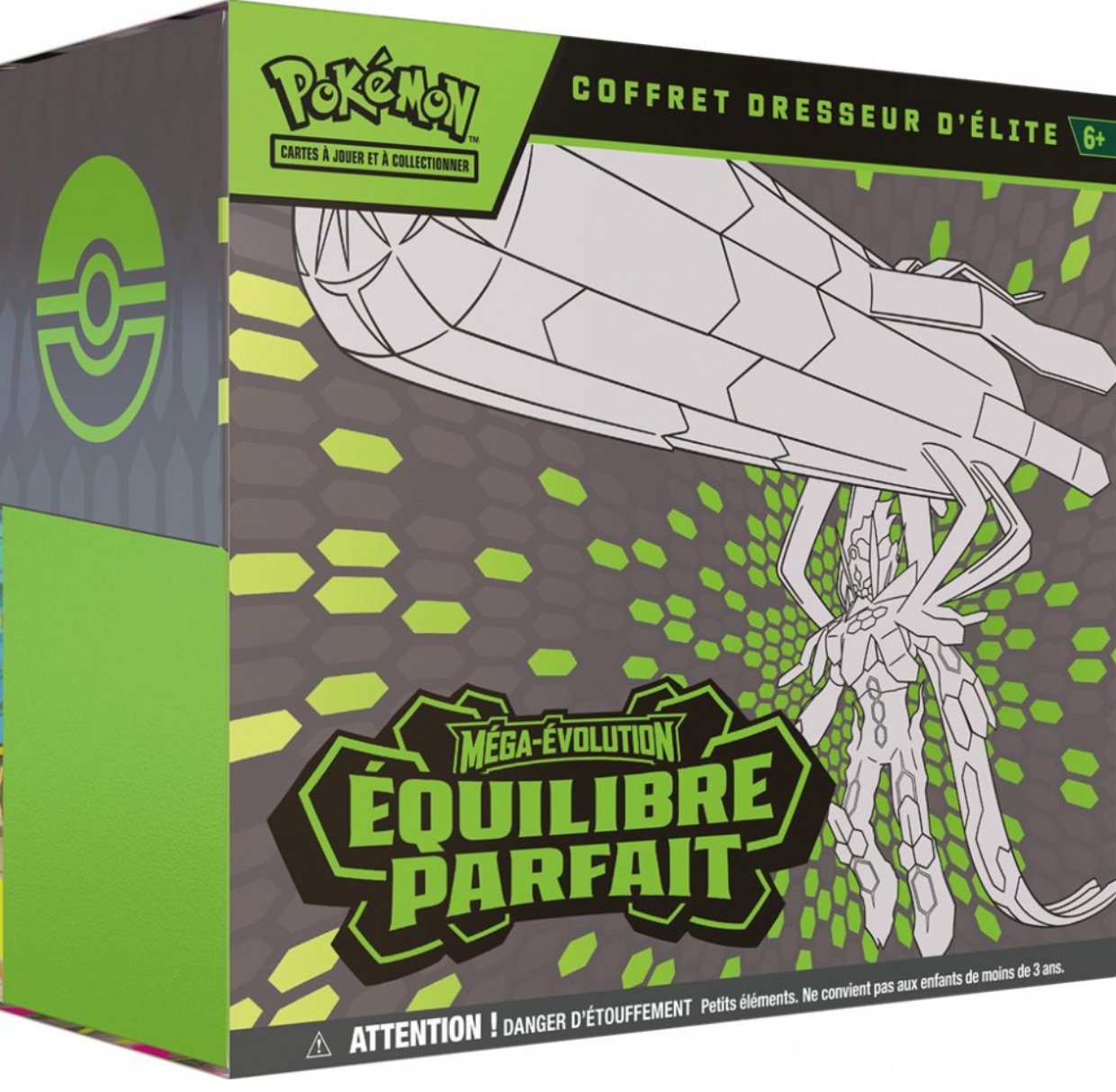Le Coffret Dresseur d'Élite Méga-Évolution – Équilibre Parfait (ETB ME03) est le produit phare de la sortie du 27 mars 2026. Incontournable à chaque extension Pokémon, l'ETB est le choix de référence des Dresseurs qui veulent tout-en-un : boosters pour la collection, carte promo exclusive, accessoires de jeu compétitif et rangement — le tout aux couleurs de Méga-Zygarde-ex, gardien légendaire de l'équilibre d'Illumis.