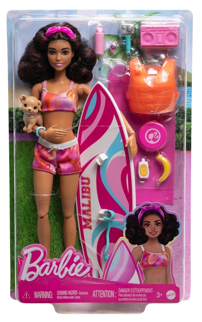 Barbie porte une tenue de surf décontractée et un bandeau, et s’accompagne d’un chiot, d’une planche de surf et d’accessoires de plage (serviette, gilet de sauvetage, gourde, montre, etc.).