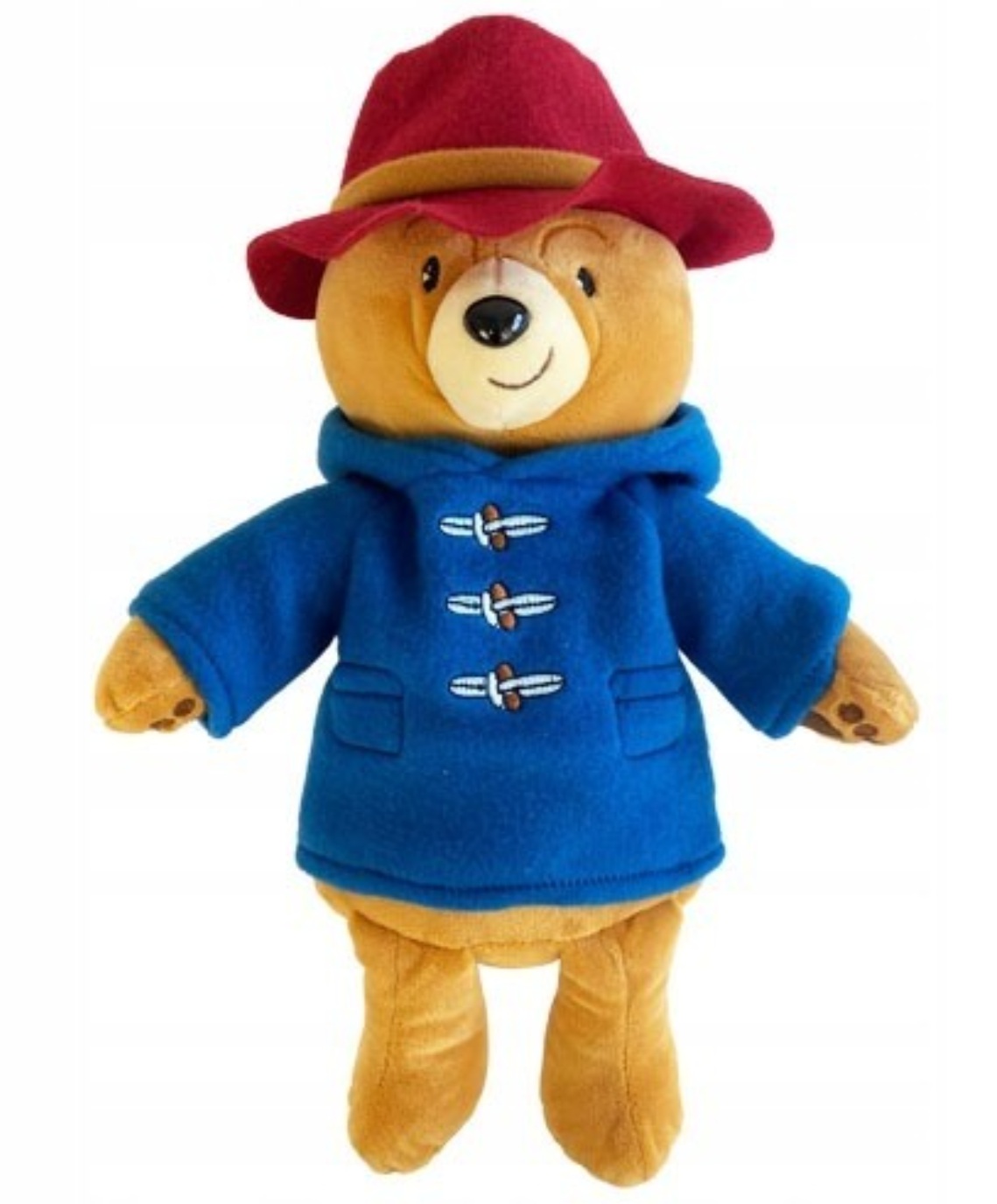 Peluche ours Paddington avec son manteau bleu et son chapeau rouge.