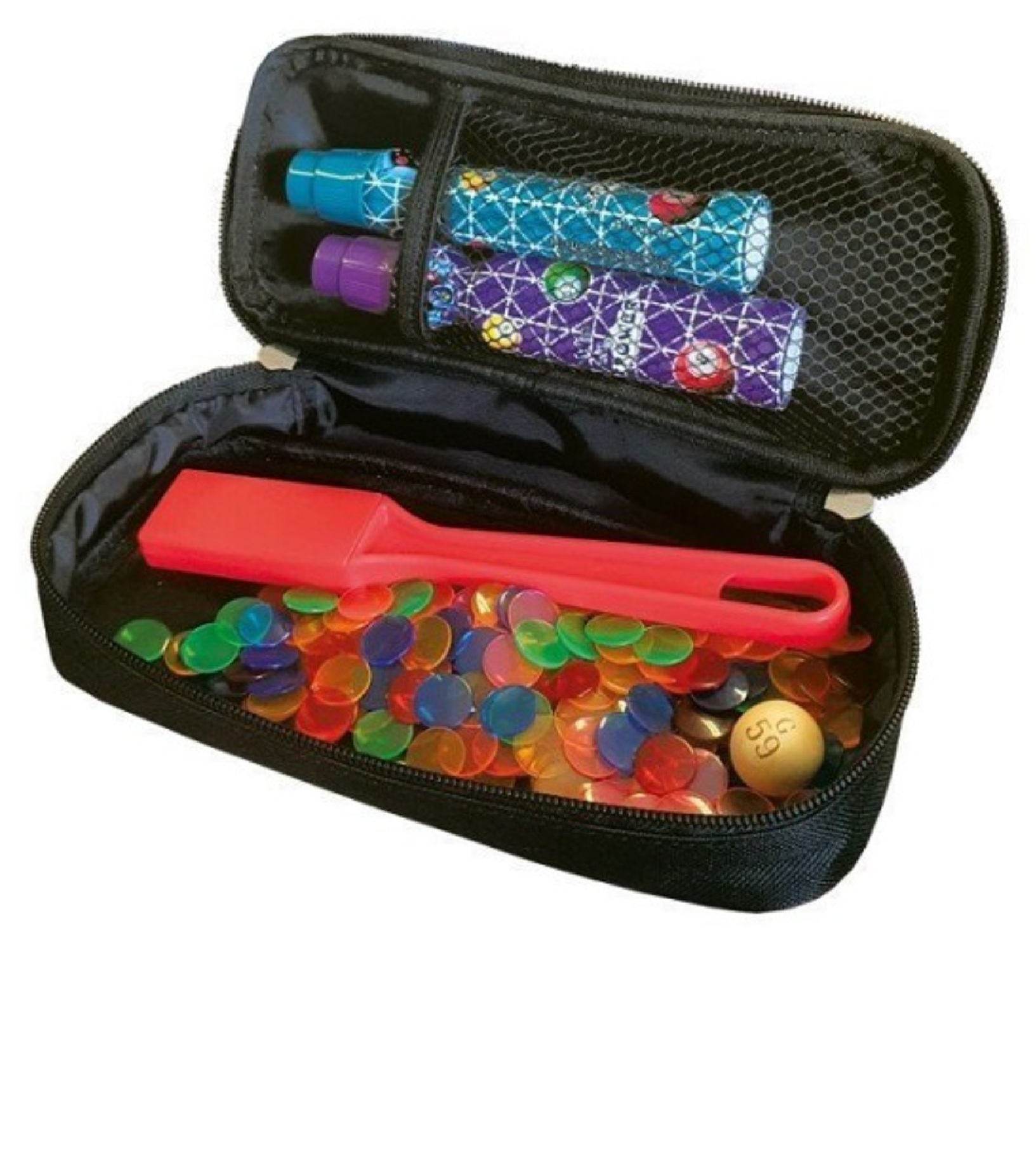 Indispensable ! Ce kit complet permet d’avoir sous la main vos accessoires de loto et bingo dans une trousse pratique et original au message imprimé "J'peux pas J'ai loto".