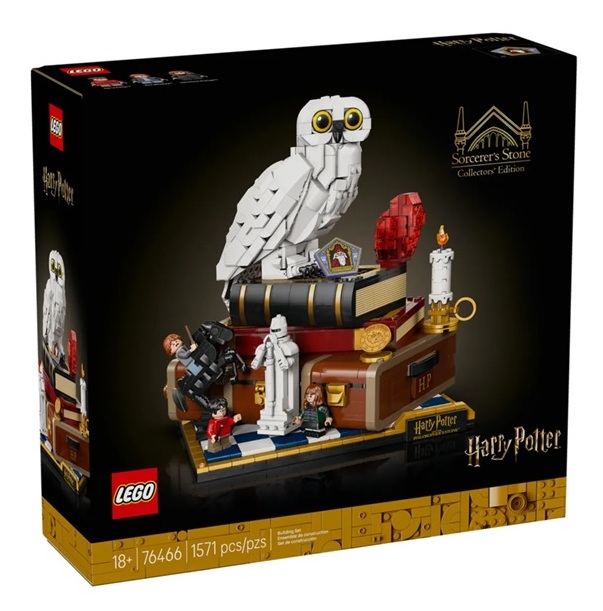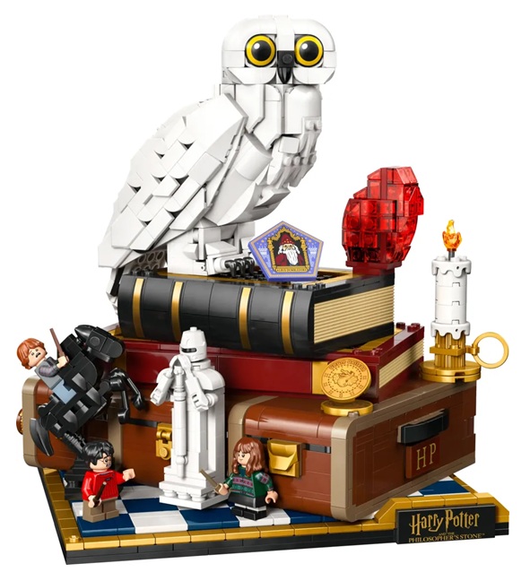 - Recréez la toute première chouette Hedwige avec des ailes fermées et exposez-la à côté de la pierre philosophale sur la malle de Harry Potter. Ajoutez les minifigurines de Harry Potter, d’Hermione Granger et de Ron Weasley, une carte Chocogrenouille et un échiquier magique.