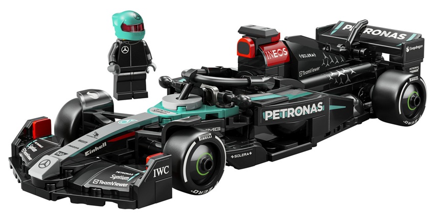 - Une minifigurine de pilote portant une tenue de l’écurie Mercedes-AMG PETRONAS et un casque est incluse. Elle peut être installée dans le cockpit.