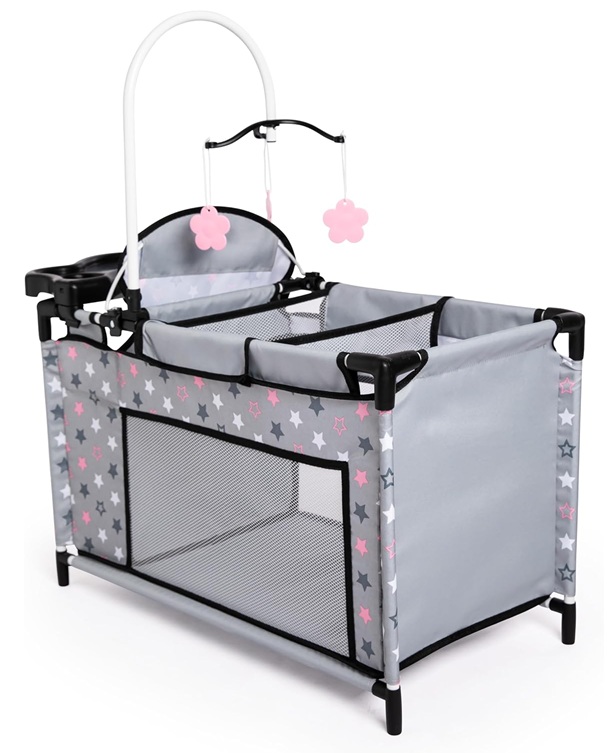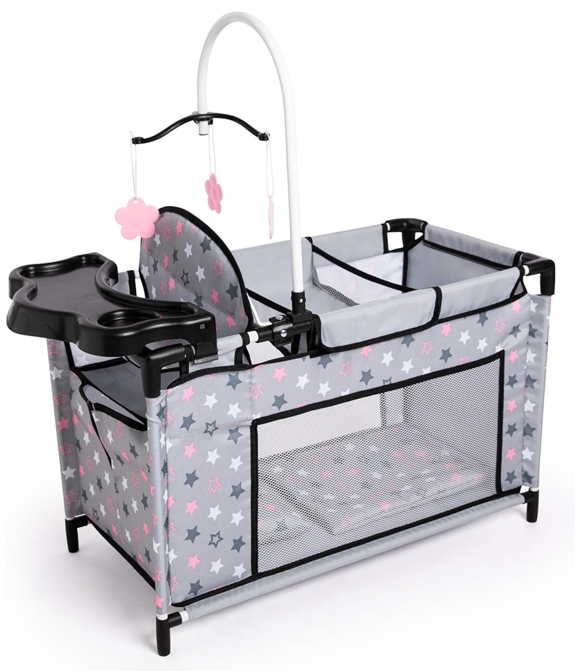 Cet ensemble pour poupée offre d'innombrables possibilités de jeu : une chaise haute intégrée avec plateau repas, une penderie fermée par un velcro avec 3 cintres inclus, un espace pour langer le poupon, un mobile pour le divertir, et un lit avec panneaux latéraux en maille filet.