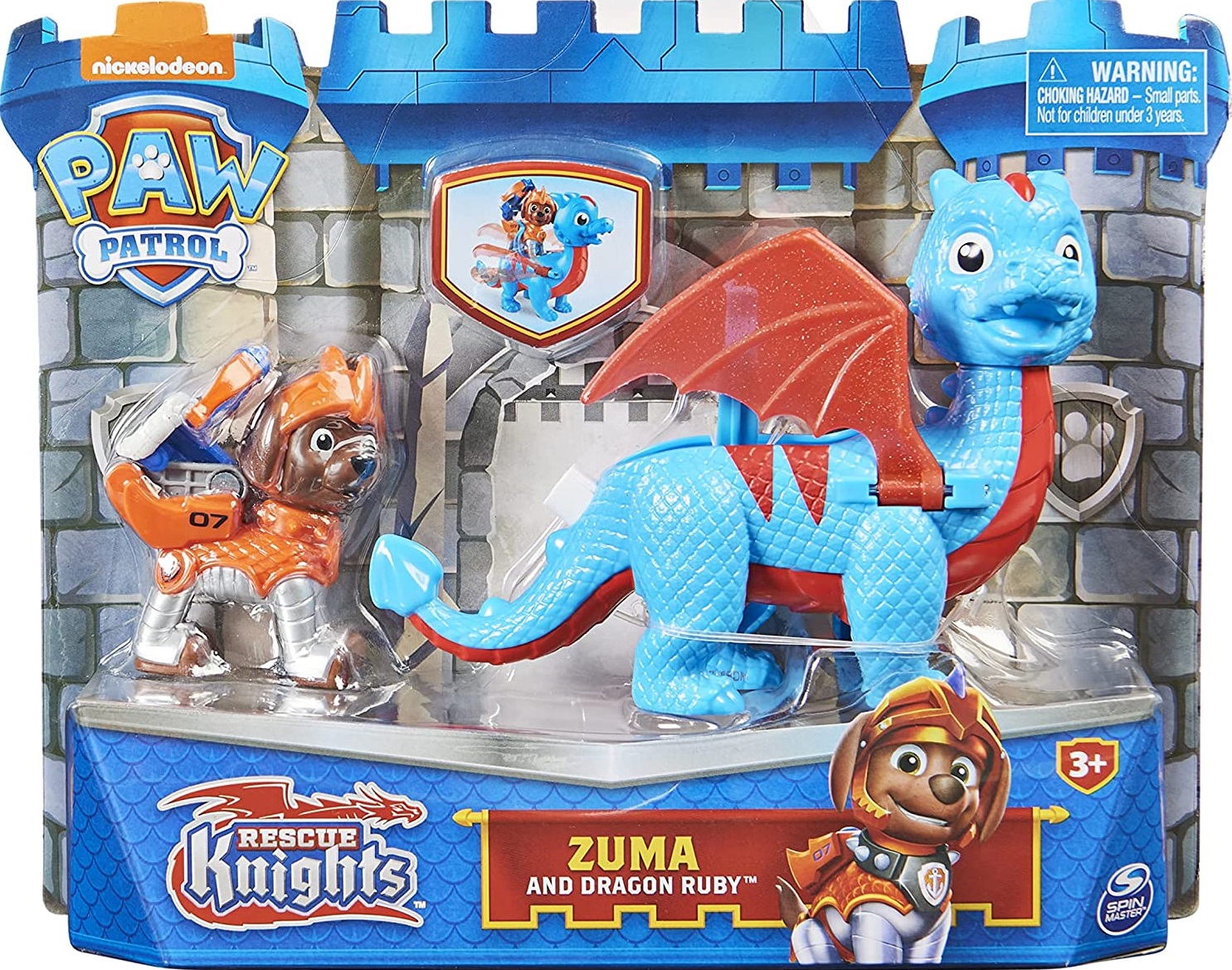 Pat patrouille Knights Rescue : Chevalier Zuma avec son dragon ruby bleu et orange.