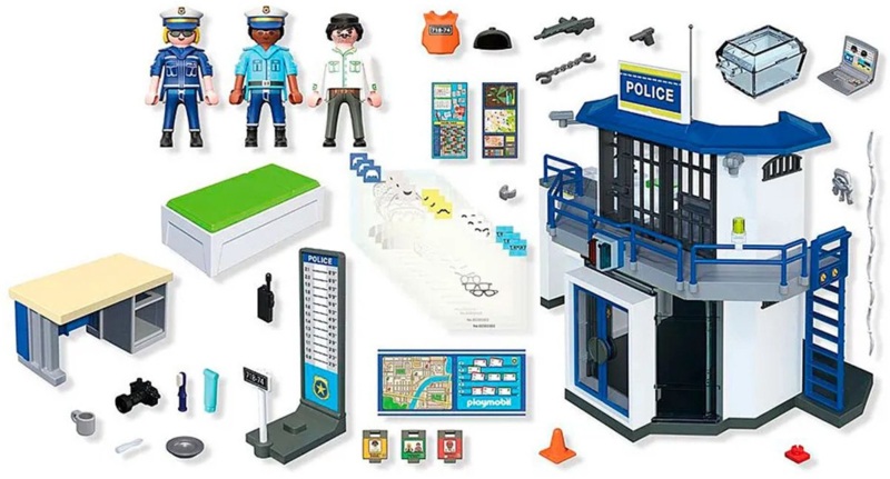 La boîte contient 3 personnages, le poste de police avec salle de recherche et de nombreux accessoires réalistes (table, chaise, lit avec matelas, lavabo, cônes de circulation, armes, etc.).
