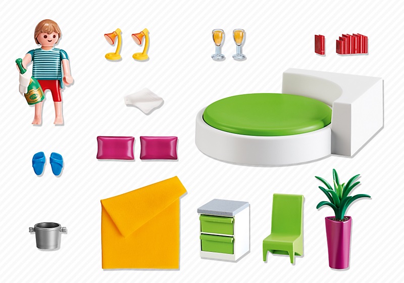 La chambre des parents comprend 1 lit rond avec tête de lit étagère, 1 commode, 1 chaise, 1 plante en pot, 2 oreillers, 1 couverture, 1 seau à champagne avec 1 bouteille, 2 flûtes et 1 serviette, des livres et 2 lampes.
