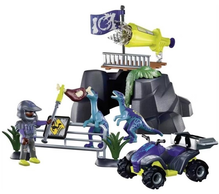 Le set inclut Jaden avec son équipement d’aventurier, 2 dinosaures, 1 quad, 2 rochers, de la végétation et des accessoires.