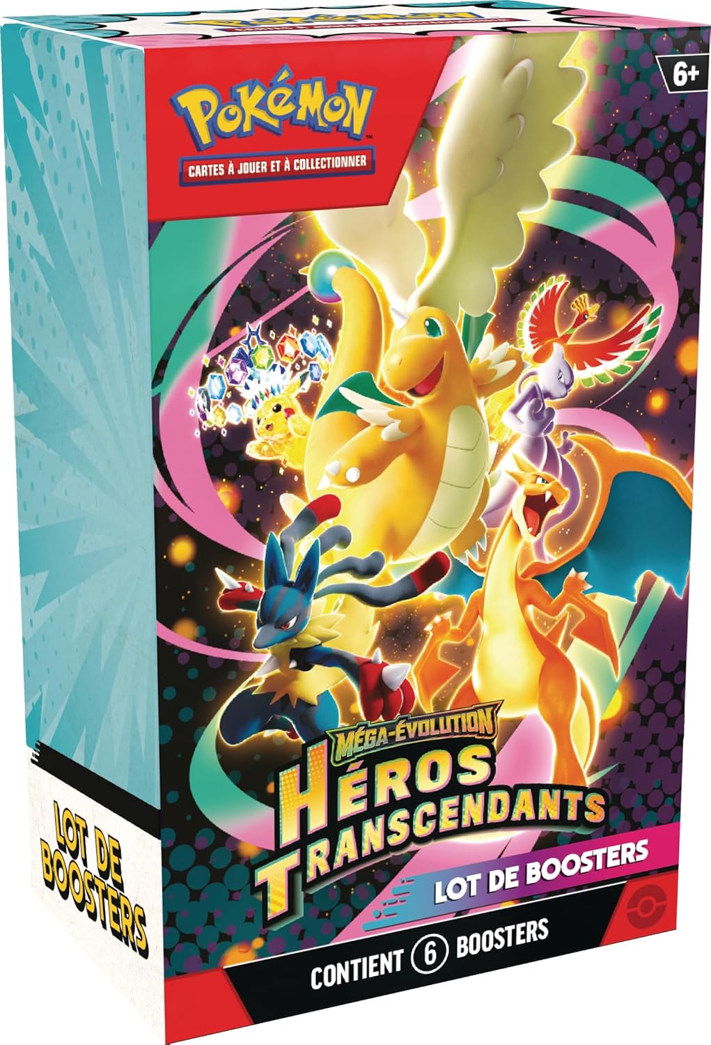 - 6 boosters Méga-Évolution – Héros Transcendants (ME2.5) de 10 cartes chacun