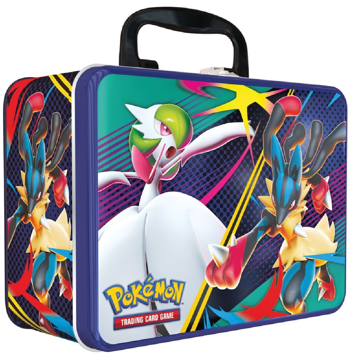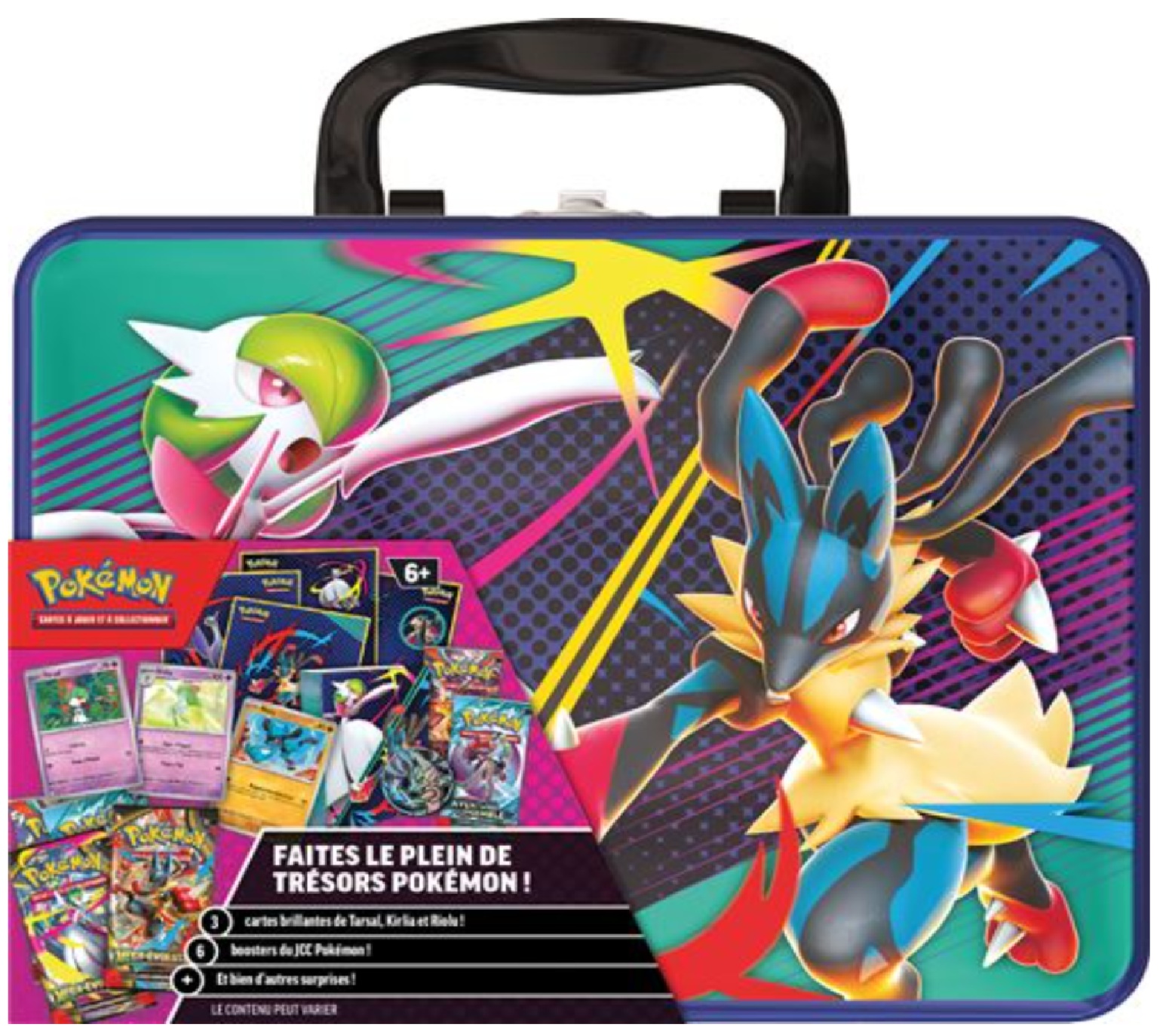 Enrichissez votre collection Pokémon et emportez vos cartes préférées à votre prochain évènement Pokémon grâce à la boîte métallique du Coffre de collection du JCC Pokémon. Cette boîte métallique contient plus d’une dizaine de surprises Pokémon, dont certaines sont introuvables ailleurs. Les cartes brillantes de Tarsal, Kirlia et Riolu brilleront dans le mini-portfolio inclus, et si vous élaborez un deck avec Méga-Gardevoir-ex ou Méga-Lucario-ex, vous pouvez y inclure ces cartes pour ajouter un peu d’éclat.