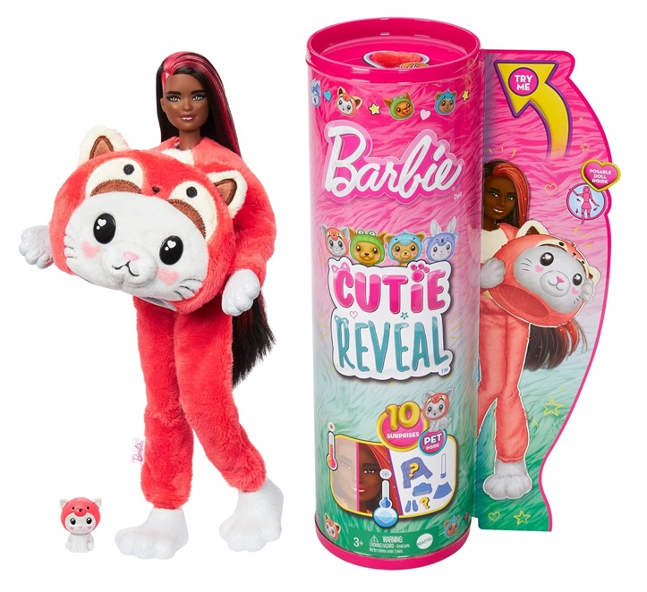 Ouvre l’emballage pour révéler un adorable chaton portant un costume de panda roux en peluche... tellement mignon ! Soulève la tête du costume pour dévoiler une poupée Barbie aux longs cheveux noirs méchés de rouge, avec des points d’articulation et des détails étincelants sur le visage.