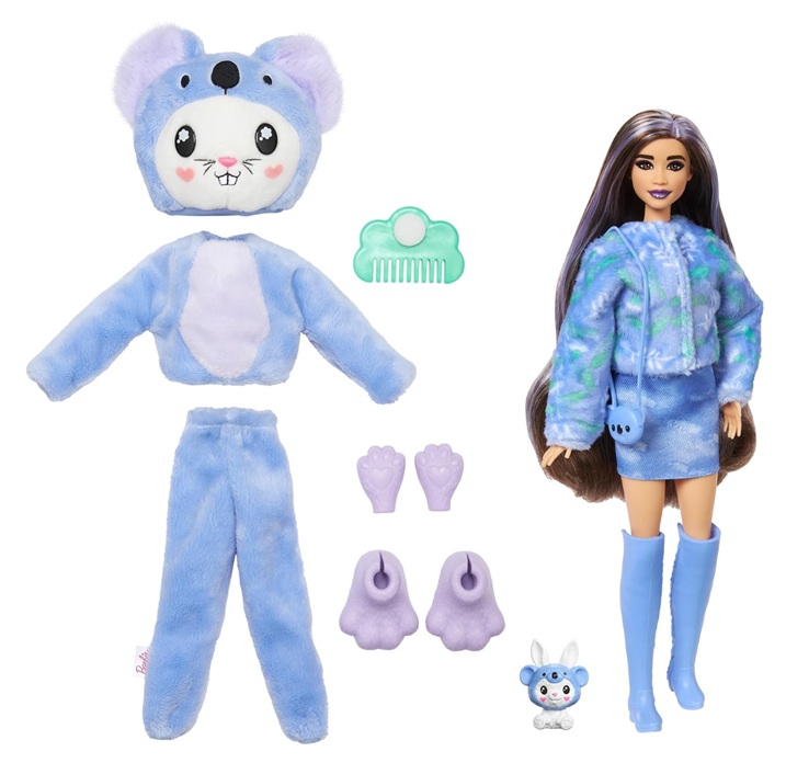 Ouvre l’emballage pour révéler un adorable lapin portant un costume de koala en peluche... tellement mignon ! Soulève la tête du costume pour dévoiler une poupée Barbie aux longs cheveux châtains méchés de violet, avec des points d’articulation et des détails étincelants sur le visage.