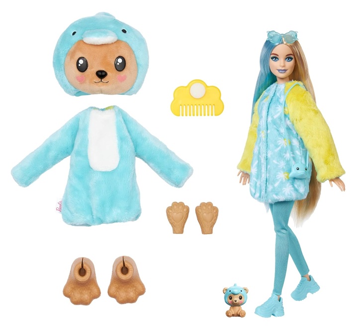 Ouvre l’emballage pour révéler un adorable ourson portant un costume de dauphin en peluche... tellement mignon ! Soulève la tête du costume pour dévoiler une poupée Barbie aux cheveux blonds rehaussés d’une large mèche bleue, avec des points d’articulation et des détails étincelants sur le visage.