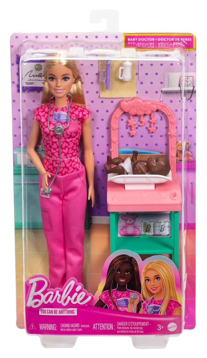 Le coffret comprend 1 poupée Barbie, 1 bébé avec couche, 1 table d’examen agrémentée d’un mobile et d’une étagère basse et des accessoires (biberon, stéthoscope, otoscope).