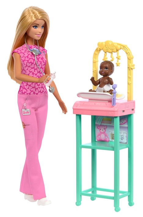 Barbie, prête à faire son métier avec enthousiasme, porte un ensemble de travail rose à imprimé cœur. Un adorable petit patient l’attend déjà dans son cabinet médical.