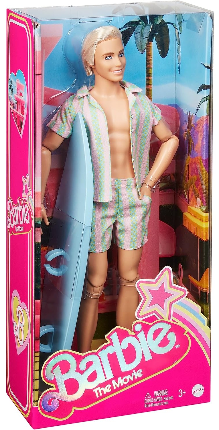 En direct du monde de Barbie, bonjour ! Inspirée du personnage de Ken dans le film Barbie, cette poupée à collectionner Ken porte un ensemble de plage rayé assorti. Avec sa planche de surf sous le bras, il passe une merveilleuse journée dans Barbie Land.
