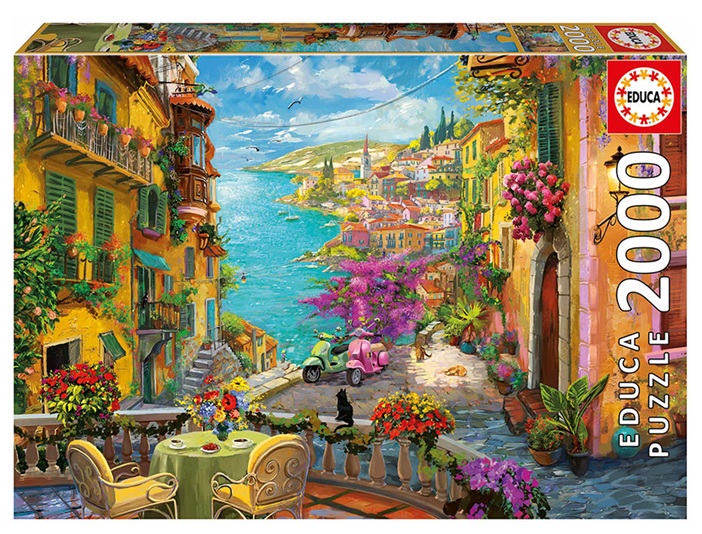 Puzzle A la terrasse d'un café en Espagne 2000 pièces - Vue mer, Maisons colorees, Paysage - Educa - 20258