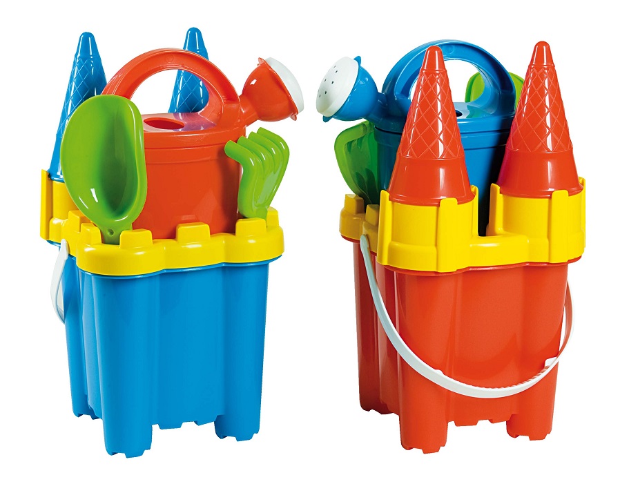 Ce seau en forme de château fort servira de moule. Et pour le compléter, l’enfant utilisera le couvercle-tamis, l’arrosoir, les outils de plage (pelle, râteau) et les 2 formes.