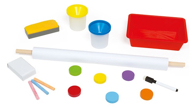 - Nombreux accessoires inclus : 6 magnets, 10 craies, 1 feutre effaçable à sec, 1 rouleau de papier et 1 brosse à tableau.