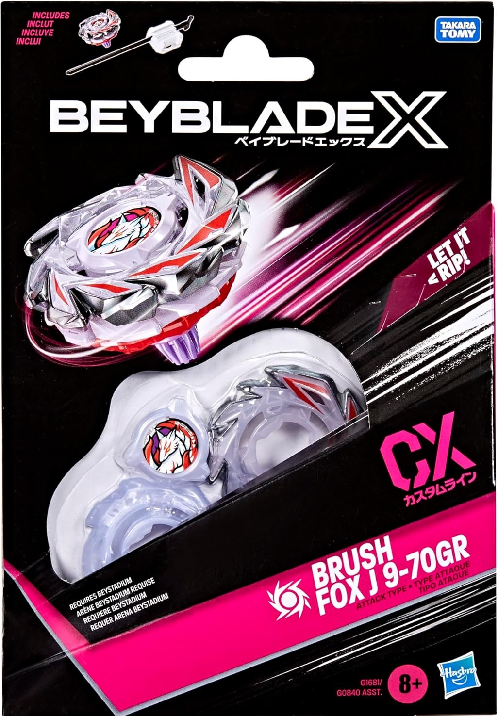 On peut vivre le frisson de la prochaine génération d'arènes, de lanceurs et de toupies Beyblade avec le Starter Pack Beyblade X Brush Fox J 9-70GR qui inclut une toupie à rotation droite de type attaque et un lanceur.