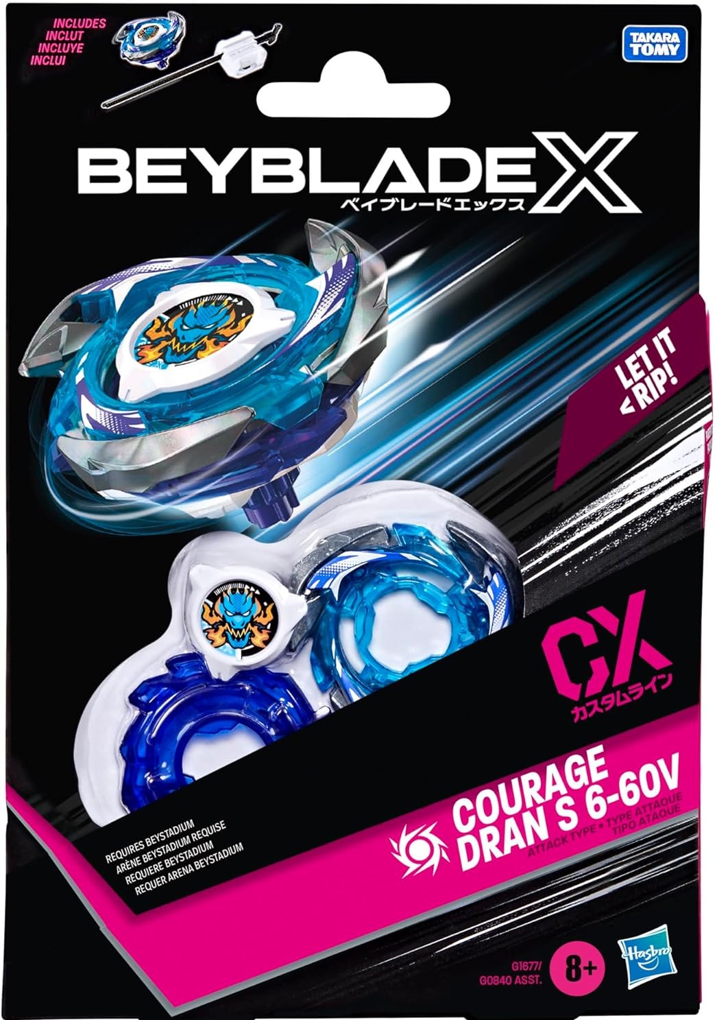 On peut vivre le frisson de la prochaine génération d'arènes, de lanceurs et de toupies Beyblade avec le Starter Pack Beyblade X Courage Dran S 6-60V CX qui inclut une toupie à rotation droite de type attaque et un lanceur.