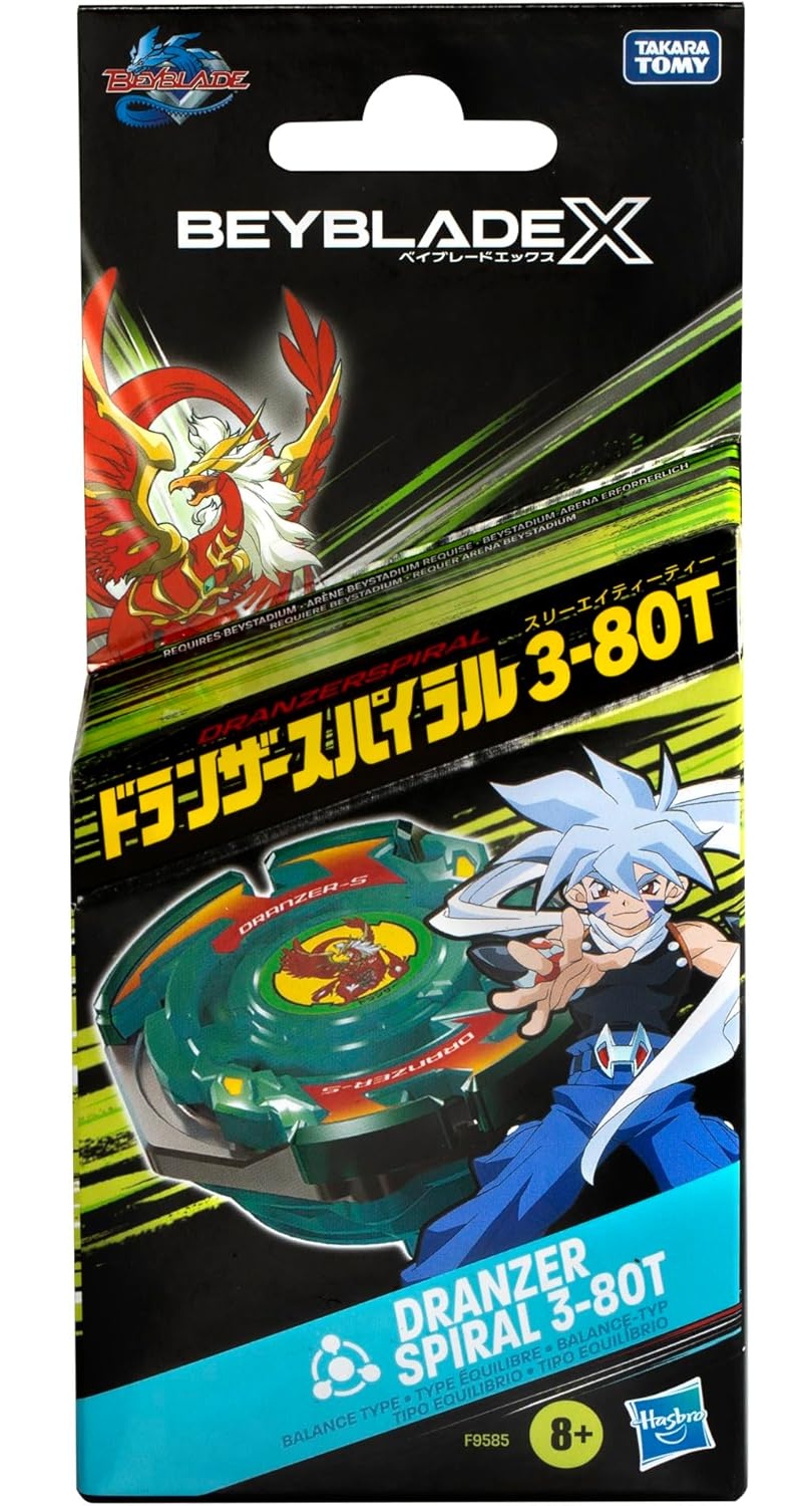 On peut vivre le frisson de la prochaine génération d'arènes, de lanceurs et de toupies Beyblade avec le Starter Pack Beyblade X Dranzer Spiral 3-80T qui inclut une toupie à rotation droite de type équilibre et un lanceur.