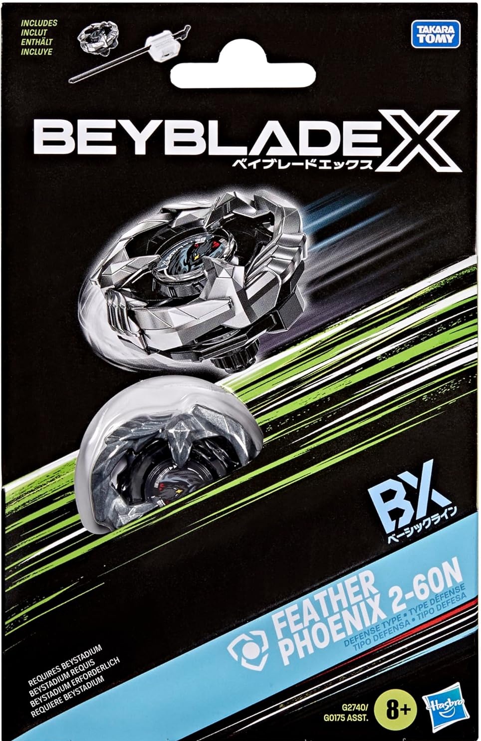 On peut vivre le frisson de la prochaine génération d'arènes, de lanceurs et de toupies Beyblade avec le Starter Pack Beyblade X Feather Phoenix 2-60N BX qui inclut une toupie à rotation droite de type défense et un lanceur.