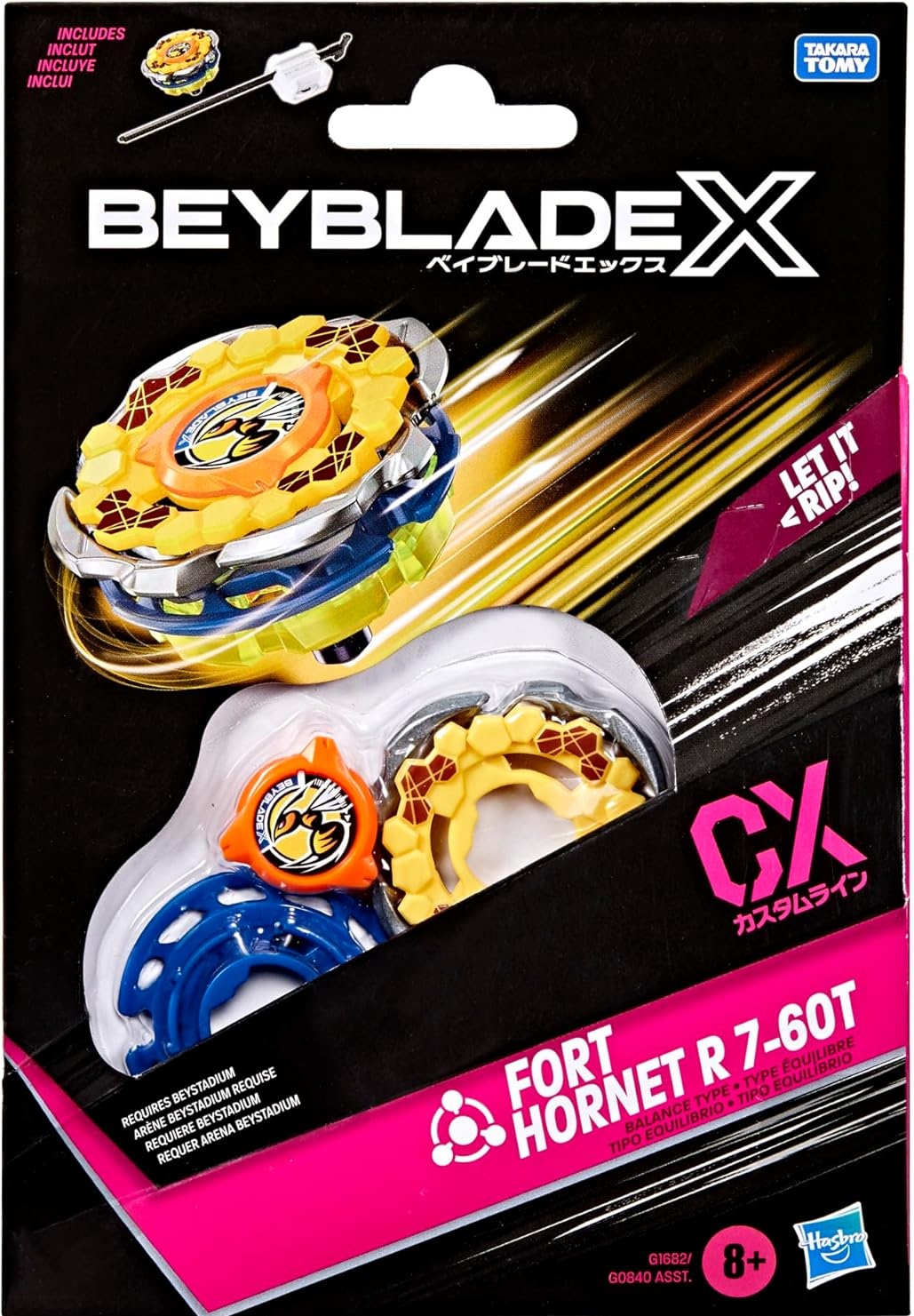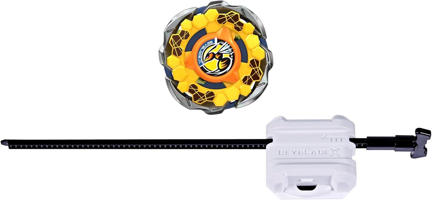 On peut vivre le frisson de la prochaine génération d'arènes, de lanceurs et de toupies Beyblade avec le Starter Pack Beyblade X Fort Hornet R 7-60T CX CX qui inclut une toupie à rotation droite de type équilibre et un lanceur.
