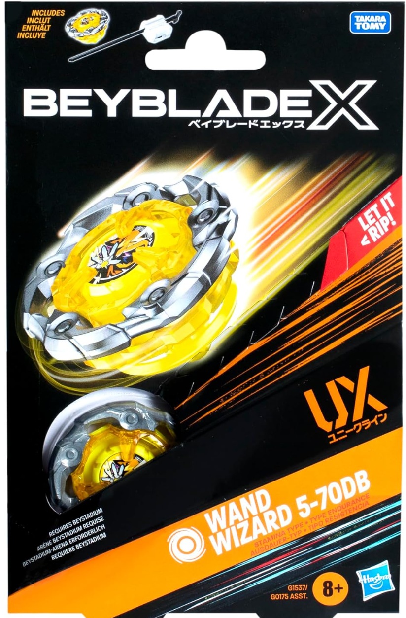 On peut vivre le frisson de la prochaine génération d'arènes, de lanceurs et de toupies Beyblade avec le Starter Pack Beyblade X Wand Wizard 5-70BD qui inclut une toupie à rotation droite de type éndurance et un lanceur.
